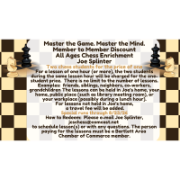 How to Redeem: Please e-mail Joe Splinter, jcschess@comcast.net to schedule lesson(s). I will answer any questions you may have. The person paying for the lessons must be a Bartlett Area Chamber of Commerce member.